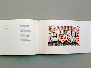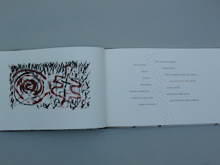 One hundred and twenty monotypes were completed for this book on a thirty inch French Tool etching press, in the Winter and Spring of the year as the bare trees shook their limbs across the Ashuelot River in full view of the Studio House windows. The poems were hand-set in Regulus, a type cut by hand by the author, with Fairbanks Italic and Sung type. The book was printed in an edition of forty at Golgonooza Letter Foundry & Press by the author and the artist on Rives BFK made in Isère in Southeastern France near the Alps. The artist bound the edition at Enitharmon Bindery.
